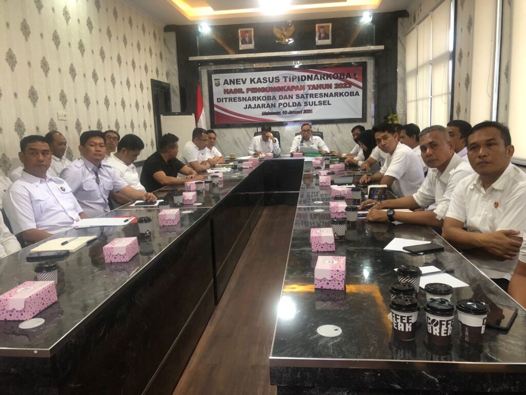 Celebesplusonline.com ( Makassar Sulsel ) — Direktorat Reserse Narkoba Polda Sulawesi Selatan, di bawah kepemimpinan KBP Darmawan Affandy, S.I.K, M.M, telah berhasil melaksanakan kegiatan Anev Pengungkapan selama Tahun 2022-2023 secara Hybrid. Plt Wadirresnarkoba Polda Sulsel, AKBP Ardiansyah, S.I.K, M.H, serta jajaran perwira dan personel dari Polrestabes Makassar, Polres Pelabuhan, Polres Gowa, dan Polres Maros turut hadir, sementara Kasatresnarkoba Jajaran lainnya mengikuti via Zoom Meeting.