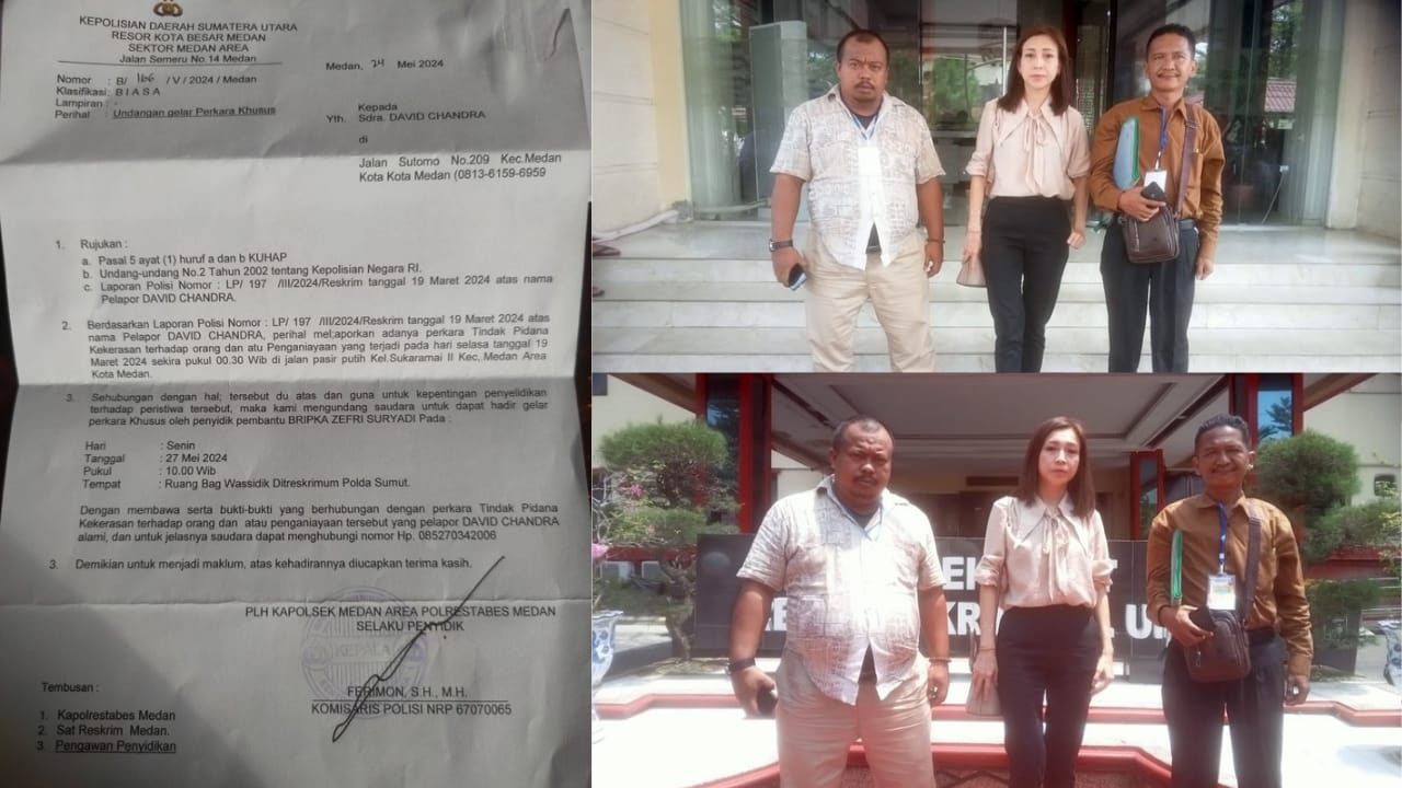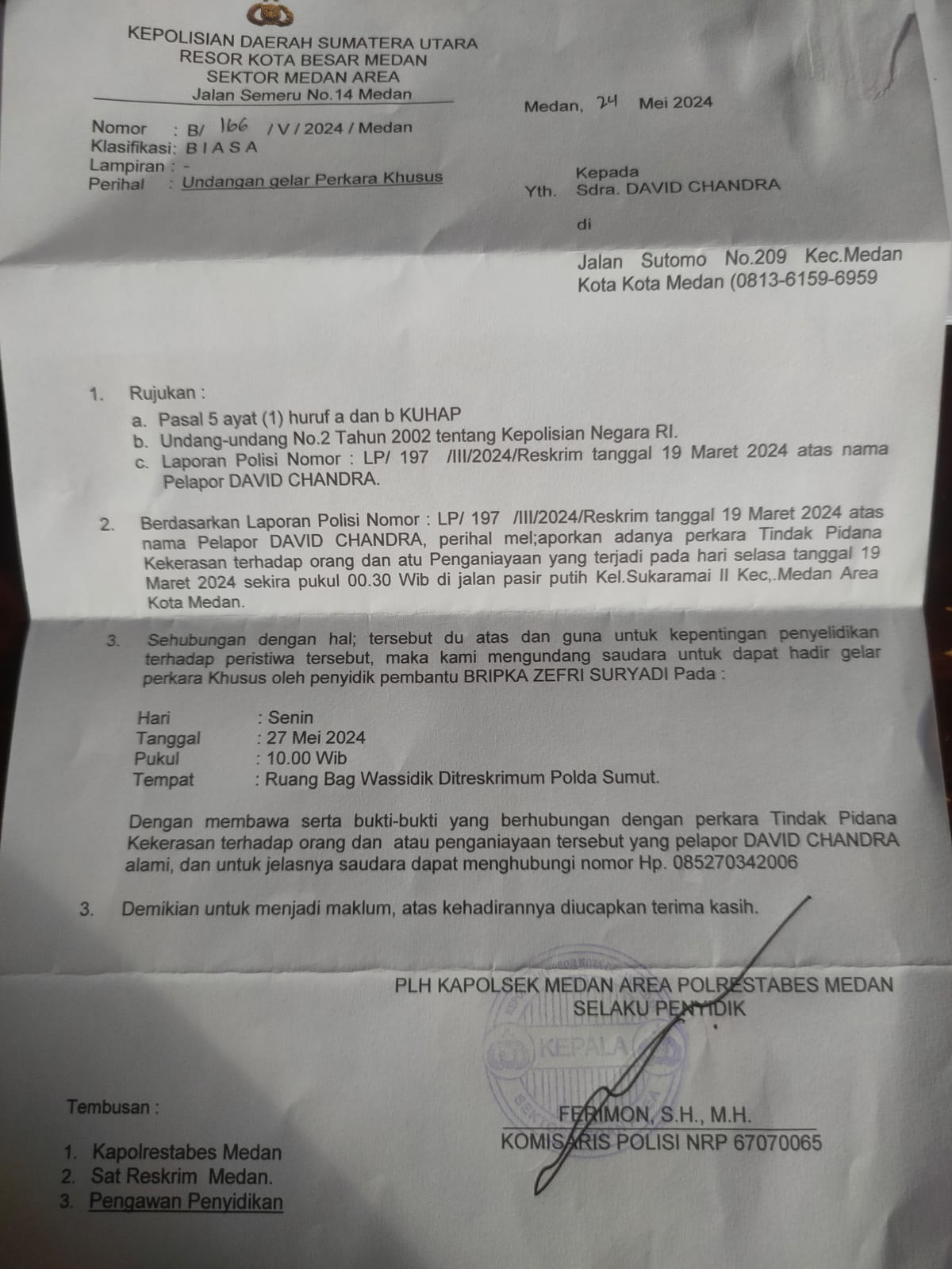 Celebesplusonline.com ( Medan ) – Sumatra Utara,* Kacau, Penyidik Polsek Medan Area,Polrestabes Medan membatalkan gelar perkara khusus yang rencana akan di gelar di ruang Wasidik Poldasu, Senin (27/5/2024).Jam 10.00 wib, sesuai dengan undangan yang di terima oleh kuasa hukum korban David Chandra dan korban Lina.