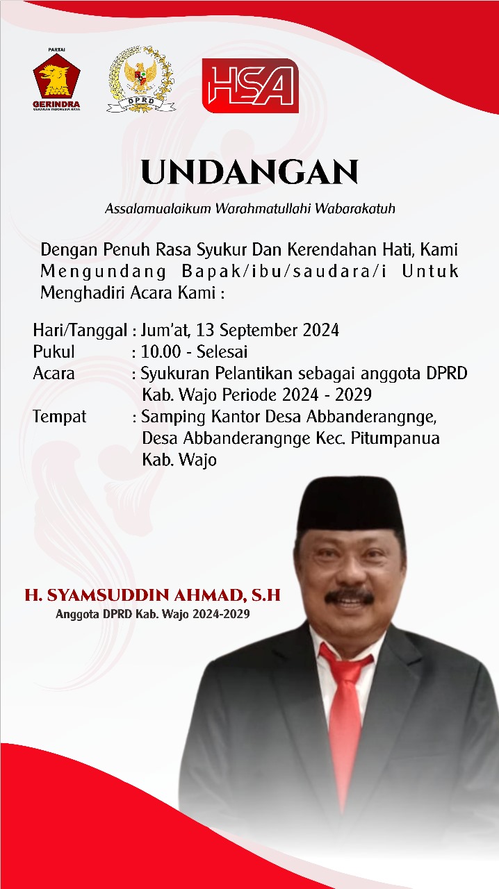 Celebesplusonline.com ( Wajo Sulsel ) Abbanderang,Jumat (13/9/2024 ) –Dalam suasana penuh sukacita,H.Syamsuddin Ahmad ( HSA ) merayakan syukuran atas keabsahannya menjadi anggota DPRD Kabupaten Wajo Periode 2024 – 2029 sejak dilantik pada hari Senin ,2 September 2024 lalu.