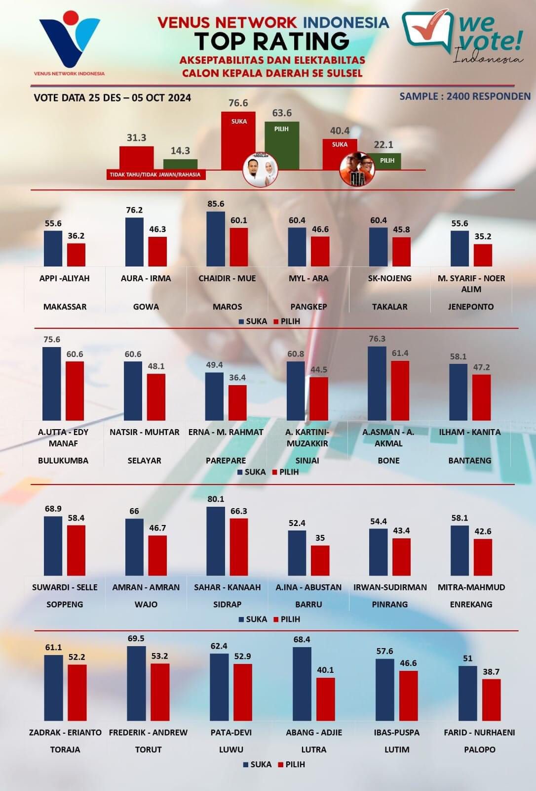 Wajo, 20 Oktober 2024 – Berdasarkan hasil survei terbaru yang dirilis oleh Venus Network Indonesia, pasangan petahana PAMMASE (Dr. Amran Mahmud dan H. Amran SE) menunjukkan performa yang unggul dalam hal akseptabilitas dan elektabilitas di Kabupaten Wajo. Survei ini dilakukan dalam rentang waktu 25 Desember 2023 hingga 5 Oktober 2024, dengan menggunakan sampel sebanyak 2.400 responden dari berbagai wilayah di Sulawesi Selatan.
