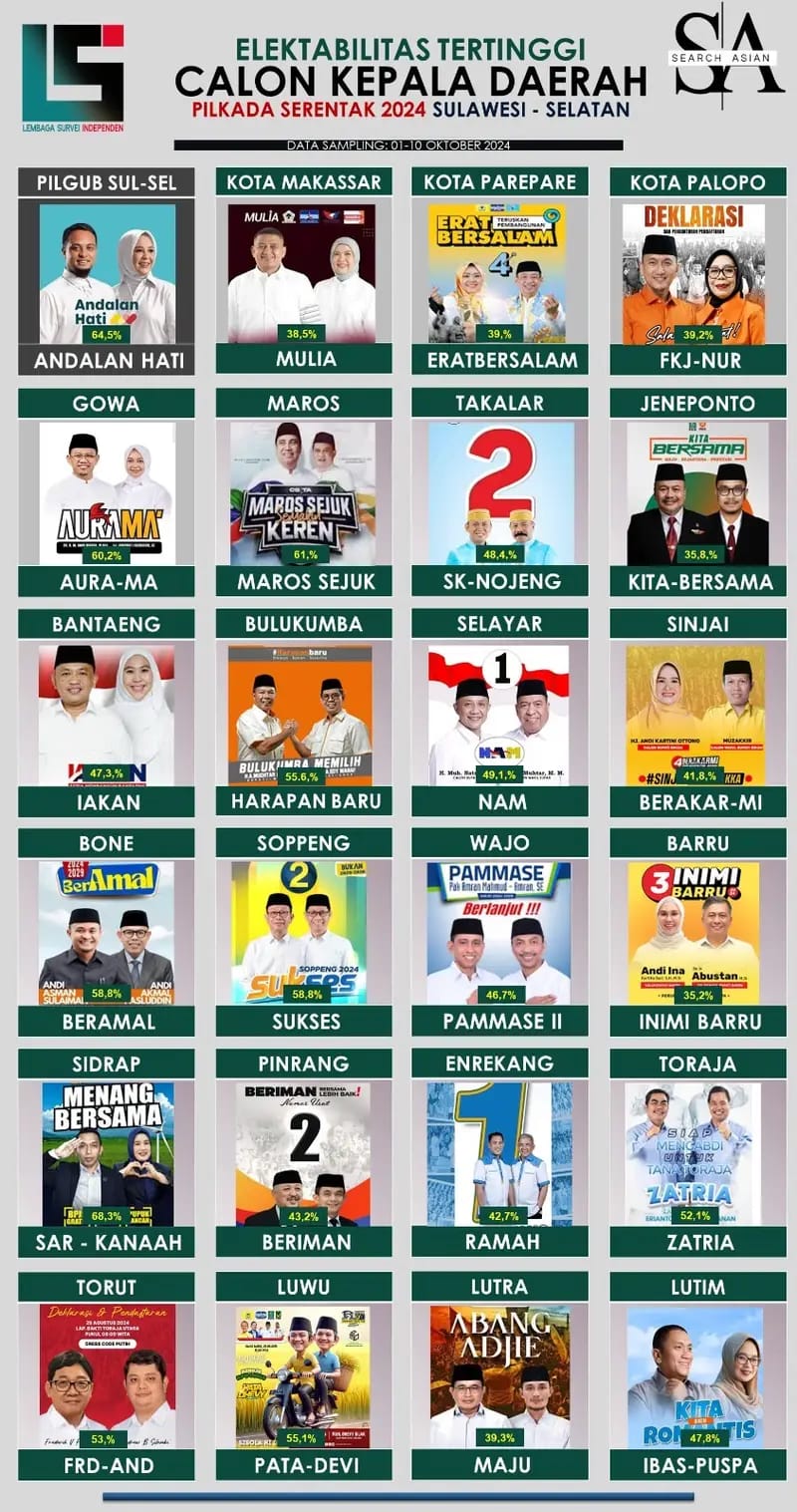 Menurut survei yang dilakukan LSI pada periode 01 sampai 10 Oktober 2024, pasangan PAMMASE mencatatkan tingkat elektabilitas sebesar 46,7%, menjadikannya pasangan dengan peluang terbesar untuk memenangkan Pilkada di Wajo. Hasil ini menunjukkan kepercayaan publik yang tinggi terhadap kepemimpinan petahana dan program-program yang mereka jalankan selama periode pertama.