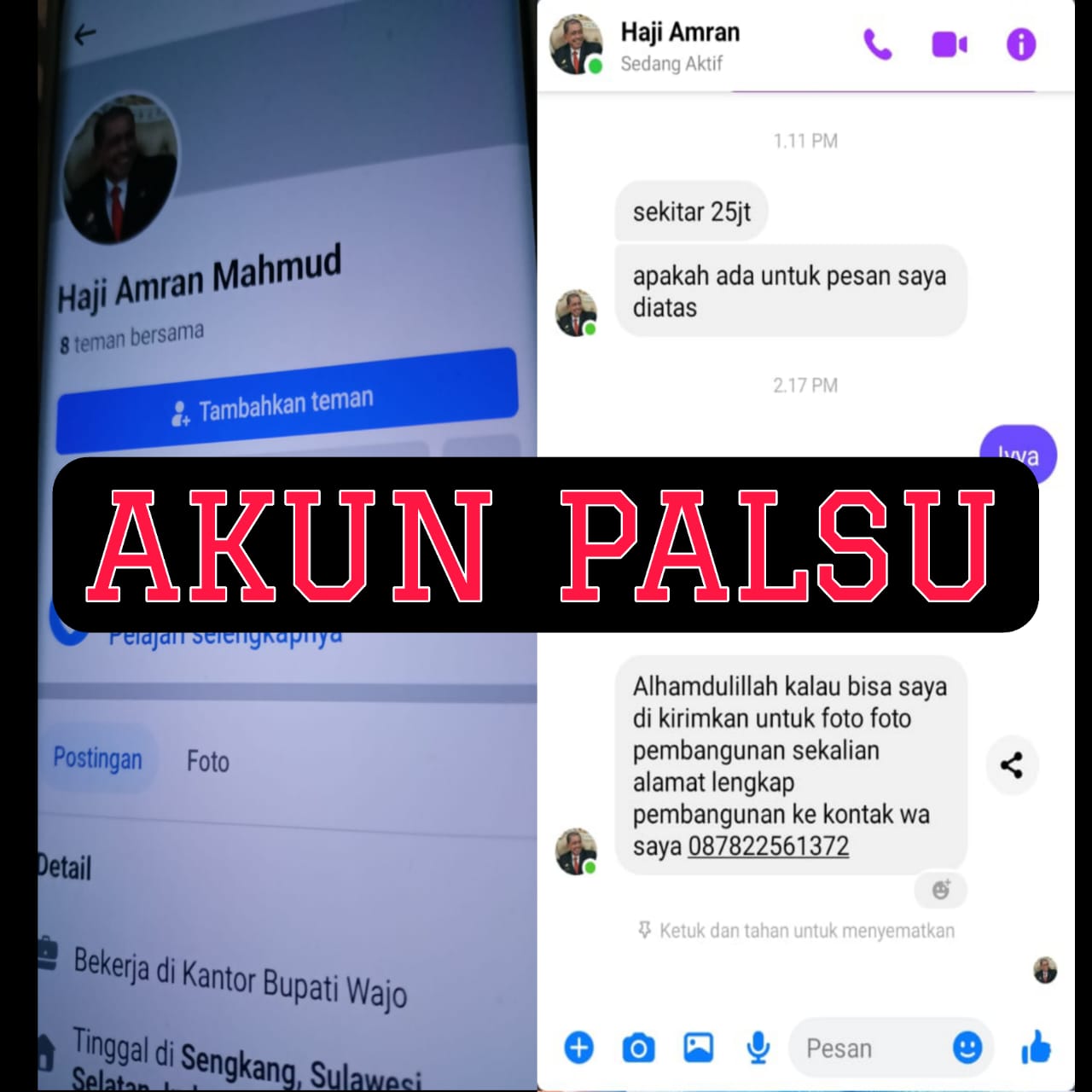 Wajo, 31 Oktober 2024 – Masyarakat Kabupaten Wajo diimbau untuk berhati-hati terkait beredarnya akun Facebook yang mengatasnamakan H. Amran Mahmud. Akun palsu ini diduga digunakan oleh pihak tidak bertanggung jawab untuk menipu masyarakat. Pihak H. Amran Mahmud menyampaikan klarifikasi resmi bahwa akun tersebut bukan milik beliau dan meminta masyarakat untuk tidak melayani atau menanggapi segala bentuk komunikasi dari akun tersebut.