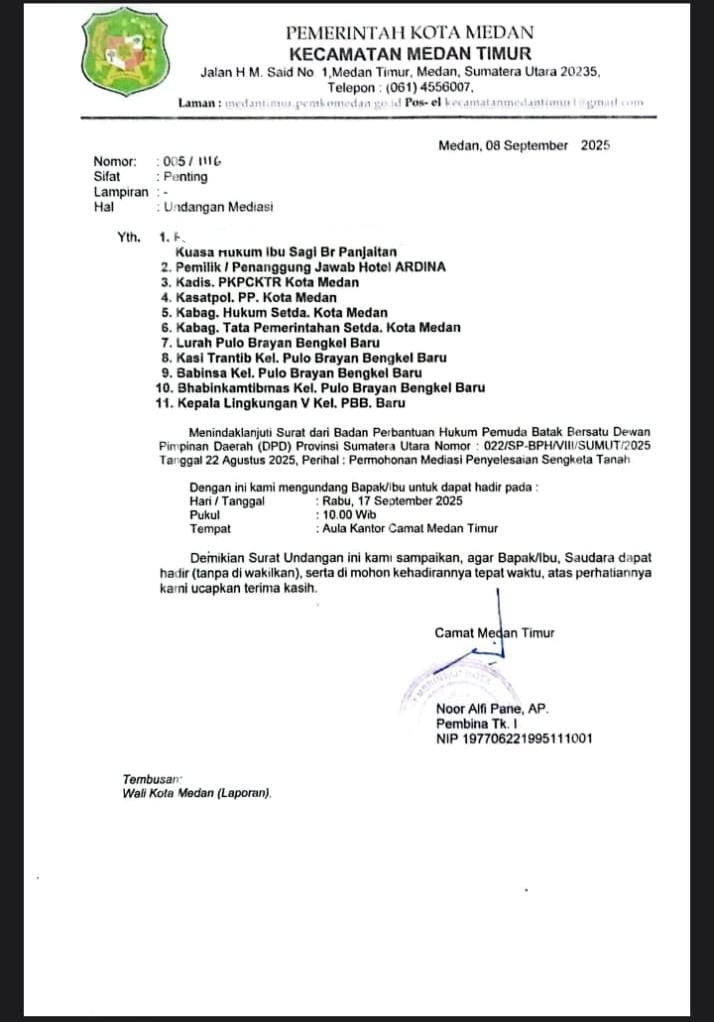 Celebesplusonline. com// Medan –Camat Medan Timur, Noor Alfi Pane, AP melalui Kasitrantib Gunung Partahian memfasilitasi musyawarah terkait Bangunan Berlantai 2 milik Hotel Ardina yang diduga melewati batas tanah milik seorang nenek Tua S Panjaitan yang terletak di kelurahan Pulo Brayan Bengkel Baru, Kecamatan Medan Baru, Rabu, 17/09/2025