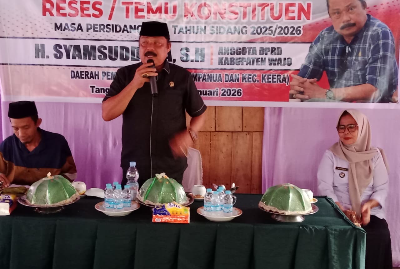 CELEBESPLUSONLINE. COM//WAJO SULSEL – Anggota DPRD Kabupaten Wajo, H. Syamsuddin Ahmad, S.H., sukses menggelar agenda Reses Masa Persidangan II Tahun Sidang 2025/2026 yang dipusatkan di Kecamatan Keera, Rabu (28/1/2026). Dalam pertemuan tersebut, legislator partai Gerindra ini menyerap sedikitnya 16 poin aspirasi krusial yang mencakup infrastruktur, pendidikan, hingga isu sosial.