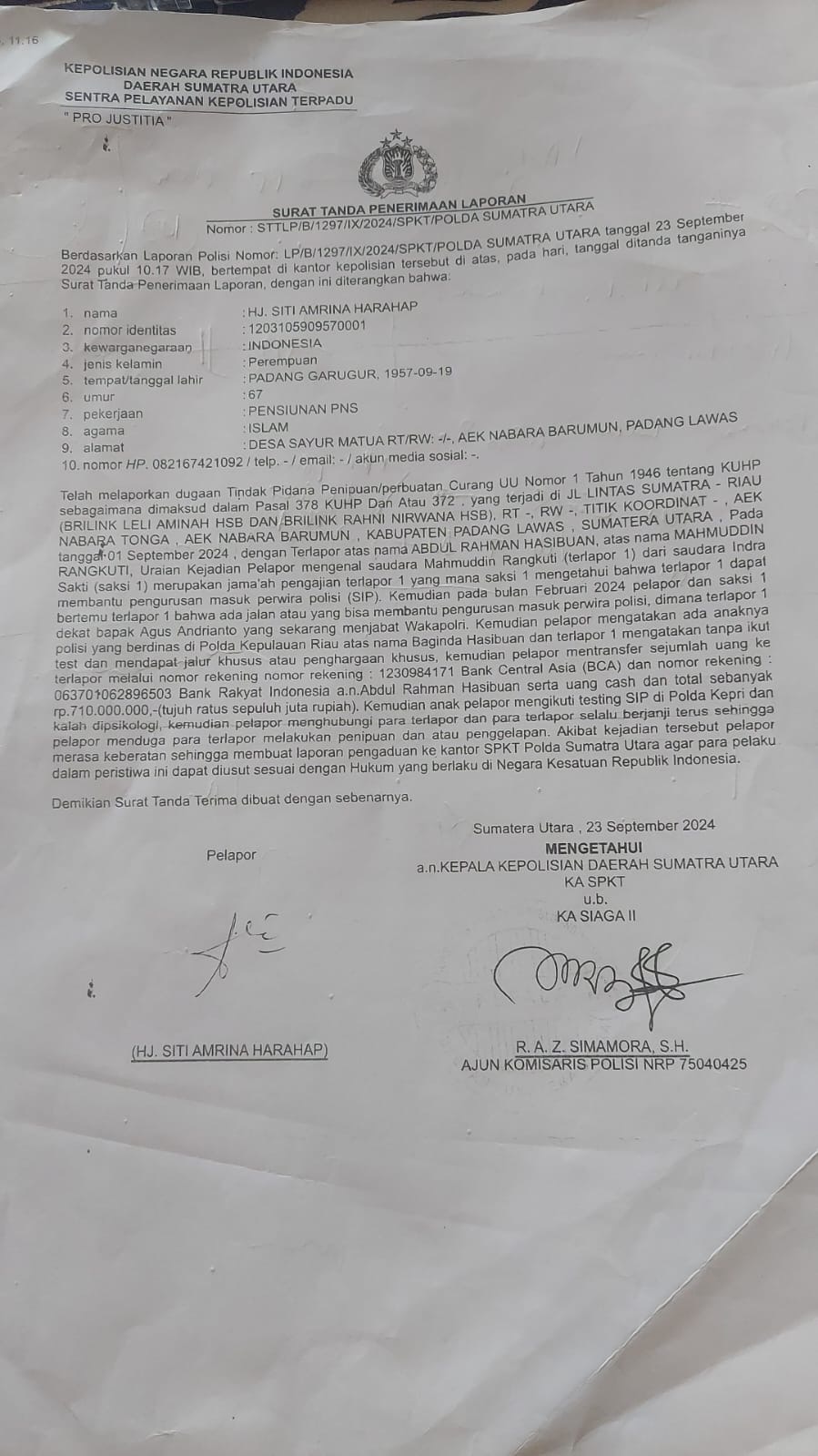 Akibatnya, ia menyerahkan total Rp710 juta. Uang itu menguap. Laporan polisi pun berjalan tanpa kepastian, tersangka belum ditetapkan, tetapi dua nama sudah berstatus Daftar Pencarian Orang (DPO).